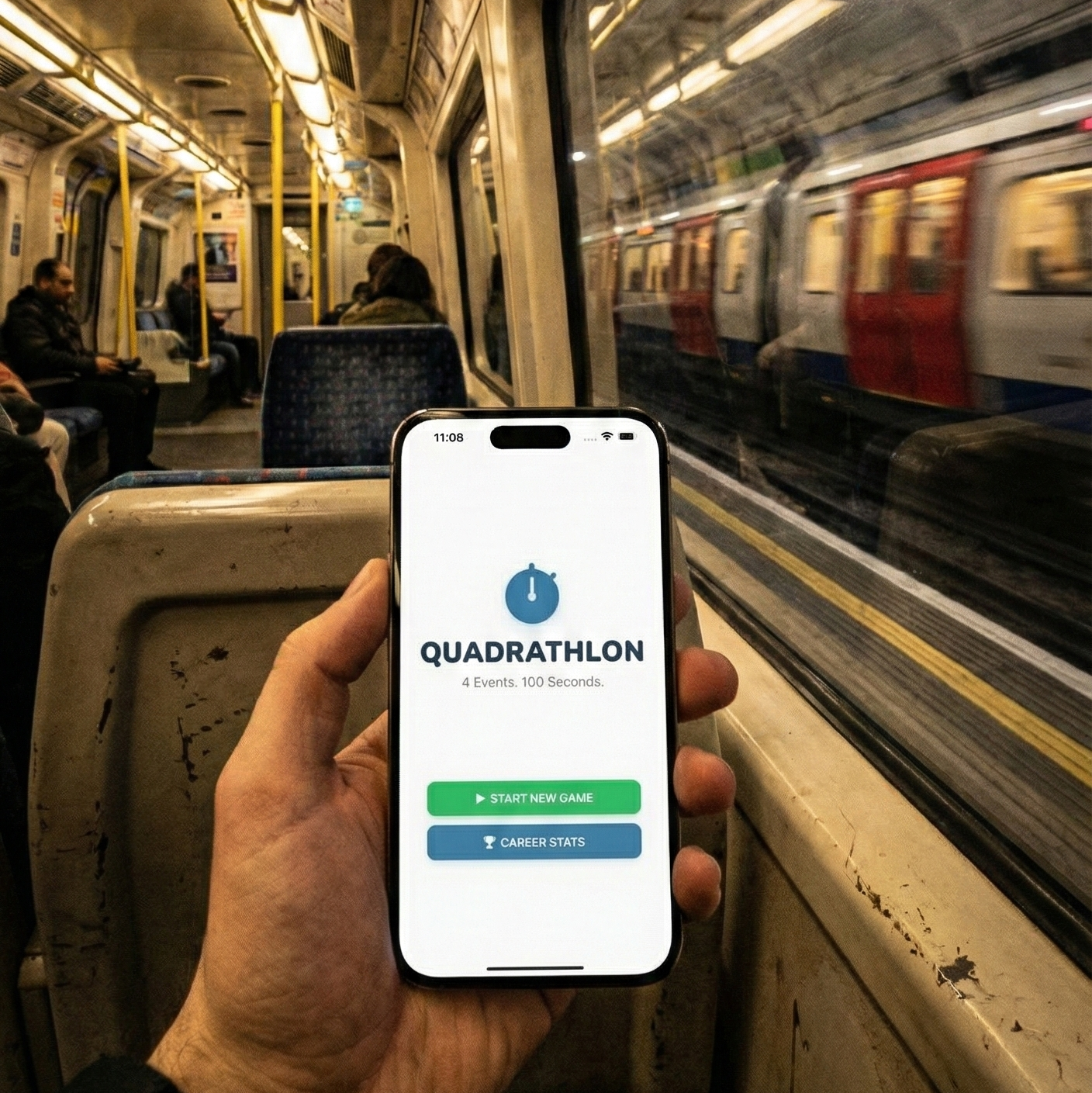 I am utterly delighted to announce the release of my first game. Quadrathlon is now available to preorder on the App Store for the whopping price of 99p. It is an ad-free, Olympic-sized word game covering four events in the ultimate test of verbal velocity.